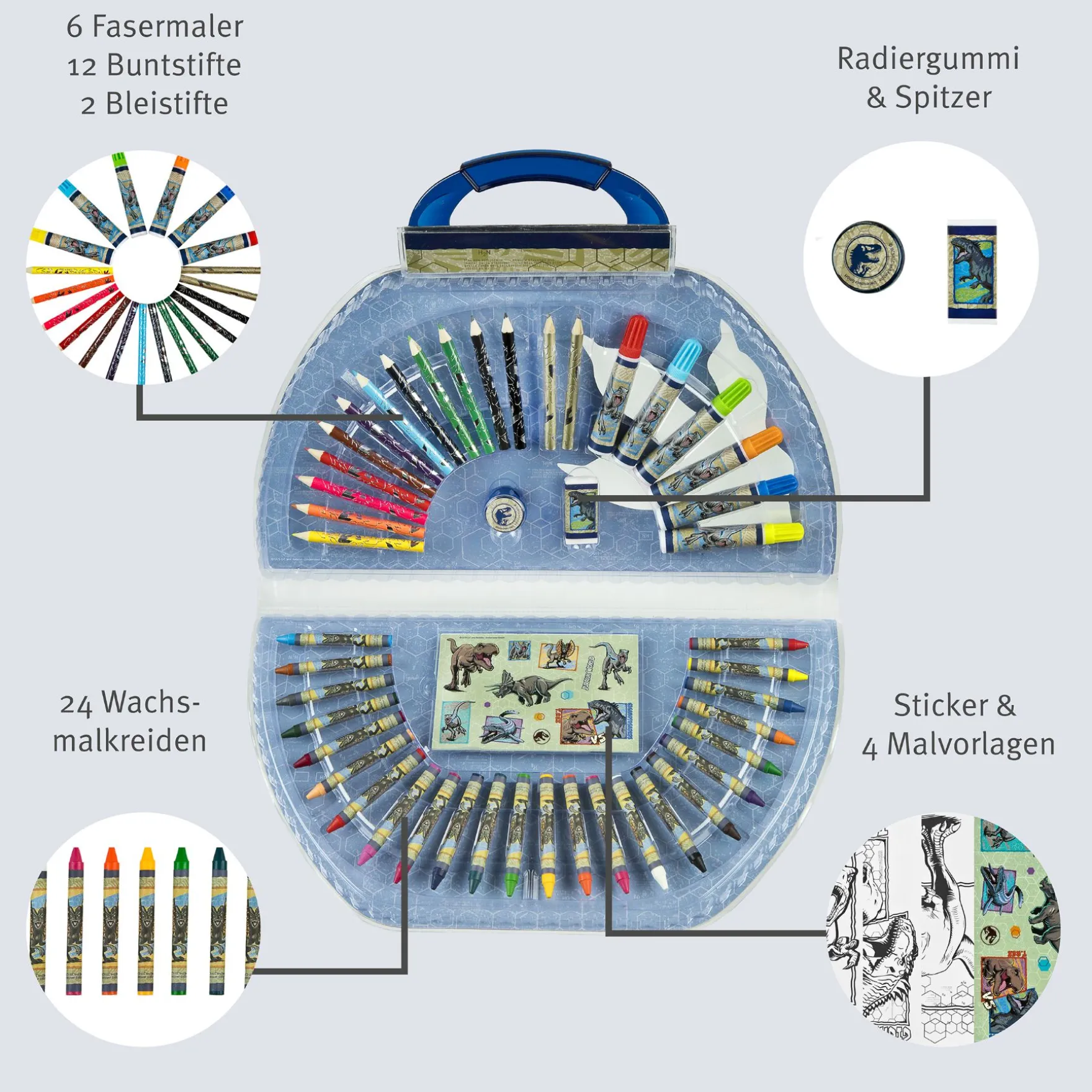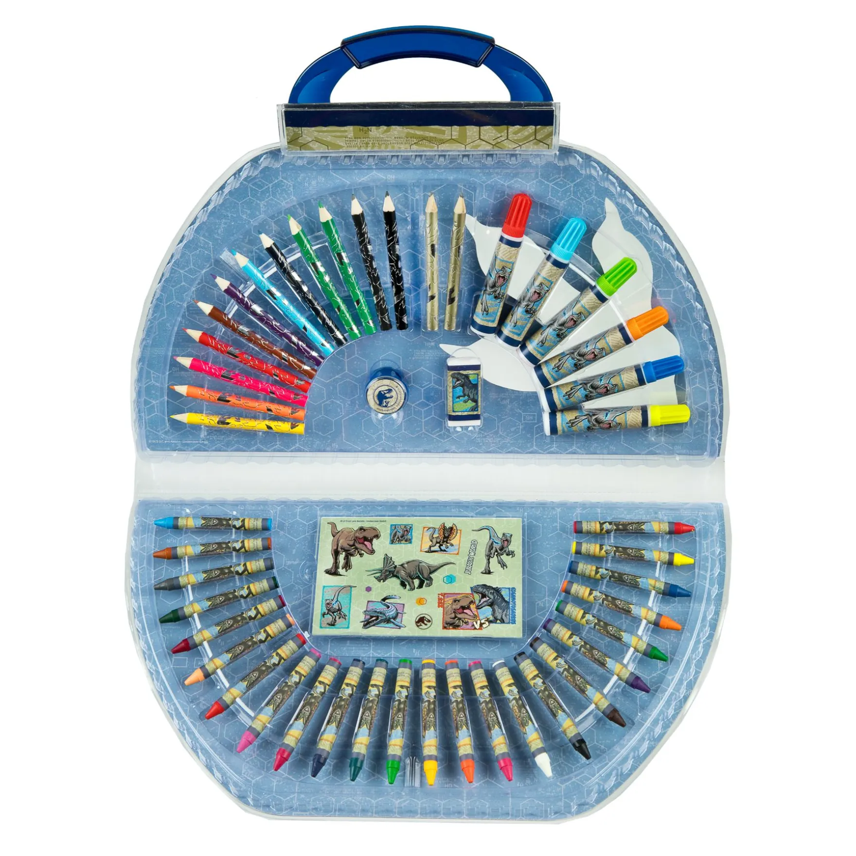 De kleurkoffer bevat 51 zorgvuldig geselecteerde kunstmaterialen, waaronder kleurpotloden, stiften, en markers, allemaal met een stoer Jurassic World-thema. Elk item in de set is ontworpen om de verbeelding van kinderen te prikkelen, met levendige kleuren en inspirerende ontwerpen die de spanning van het Jurassic World-universum vastleggen.