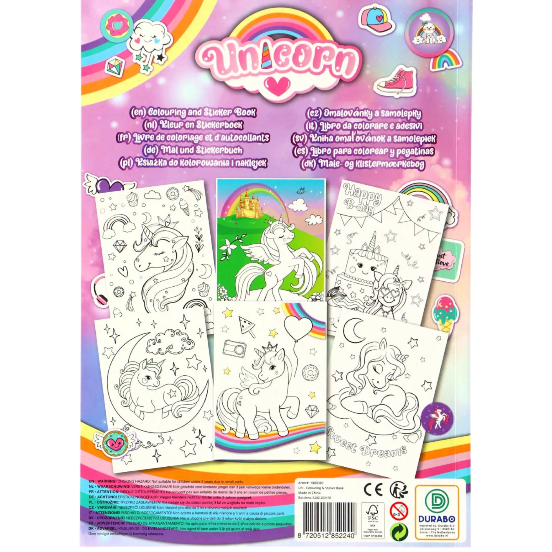 Dit boek biedt niet alleen kleurplaten, maar ook een schat aan glinsterende stickers om je kunstwerken te versieren. Laat je creativiteit de vrije loop en geef je eenhoorns, regenbogen en andere betoverende elementen een sprankelende touch met deze glanzende stickers.