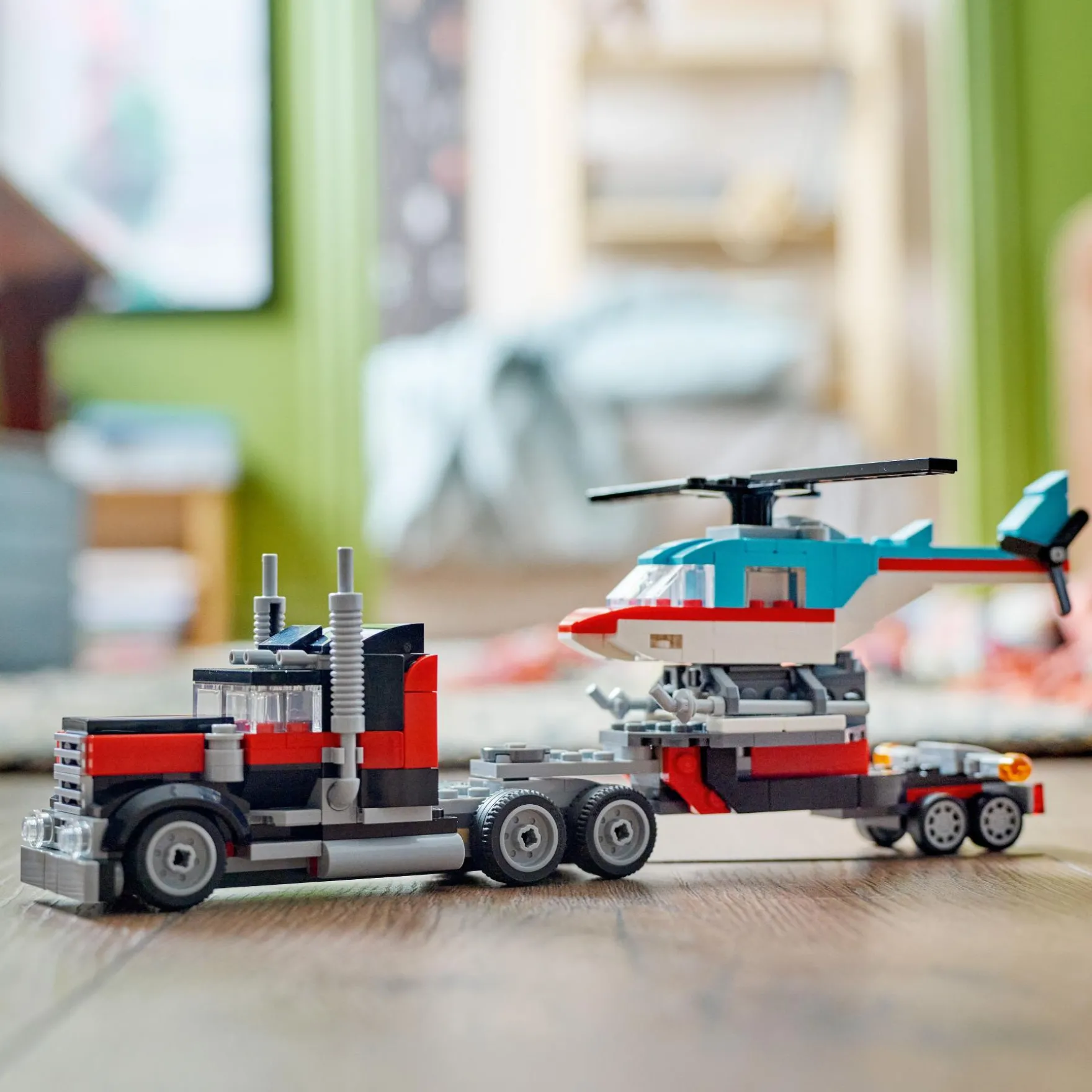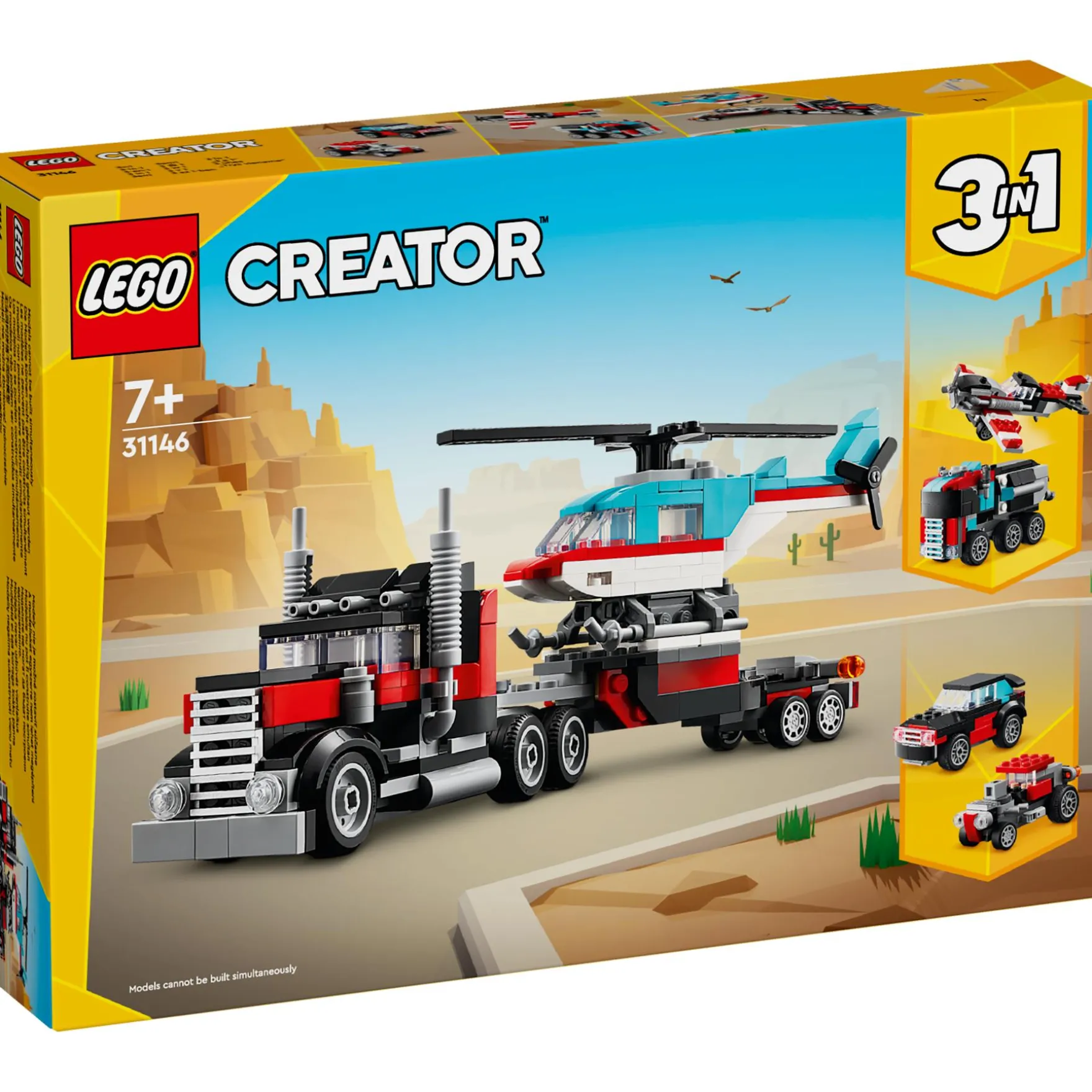 Er staan jongens en meisjes vanaf 7 jaar snelle avonturen te wachten met de LEGO Creator Truck met helikopter (31146) 3in1 set. Ze kunnen de 270 onderdelen van de LEGO Creator set gebruiken om een coole transportwagen met beweegbare wielen te bouwen die een LEGO helikopter met draaibare rotorbladen kan vervoeren op de oplegger. Kinderen kunnen met dit LEGO Creator speelgoed 3 verschillende combinaties van 2 afzonderlijke speelgoed voertuigen bouwen. Ze kunnen de speelgoed vrachtwagen met helikopter bouwen, deze ombouwen tot een propellervliegtuig en een brandstoftruck met bewegende wielen of een hot rod en terreinwagen – of de stenen gebruiken om hun eigen voertuigen te bedenken. LEGO Creator 3in1 speelgoed is een geweldig cadeau met in elke doos 3 bouwmogelijkheden voor kinderen die houden van speelgoed auto’s, speelgoed vliegtuigen, LEGO voertuigen en bouwsets. Kinderen zullen de modellen graag bouwen, herbouwen en opnieuw bouwen. Ze kunnen zich urenlang vermaken met 3in1 sets die aansluiten op hun interesses, waaronder snelle voertuigen, geweldige dieren en gedetailleerde stadstaferelen. Afmetingen: deze bouwset bevat een bouwbare speelgoedvrachtwagen van ca. 9 cm hoog, 26 cm lang en 6 cm breed. Bevat 270 onderdelen.
