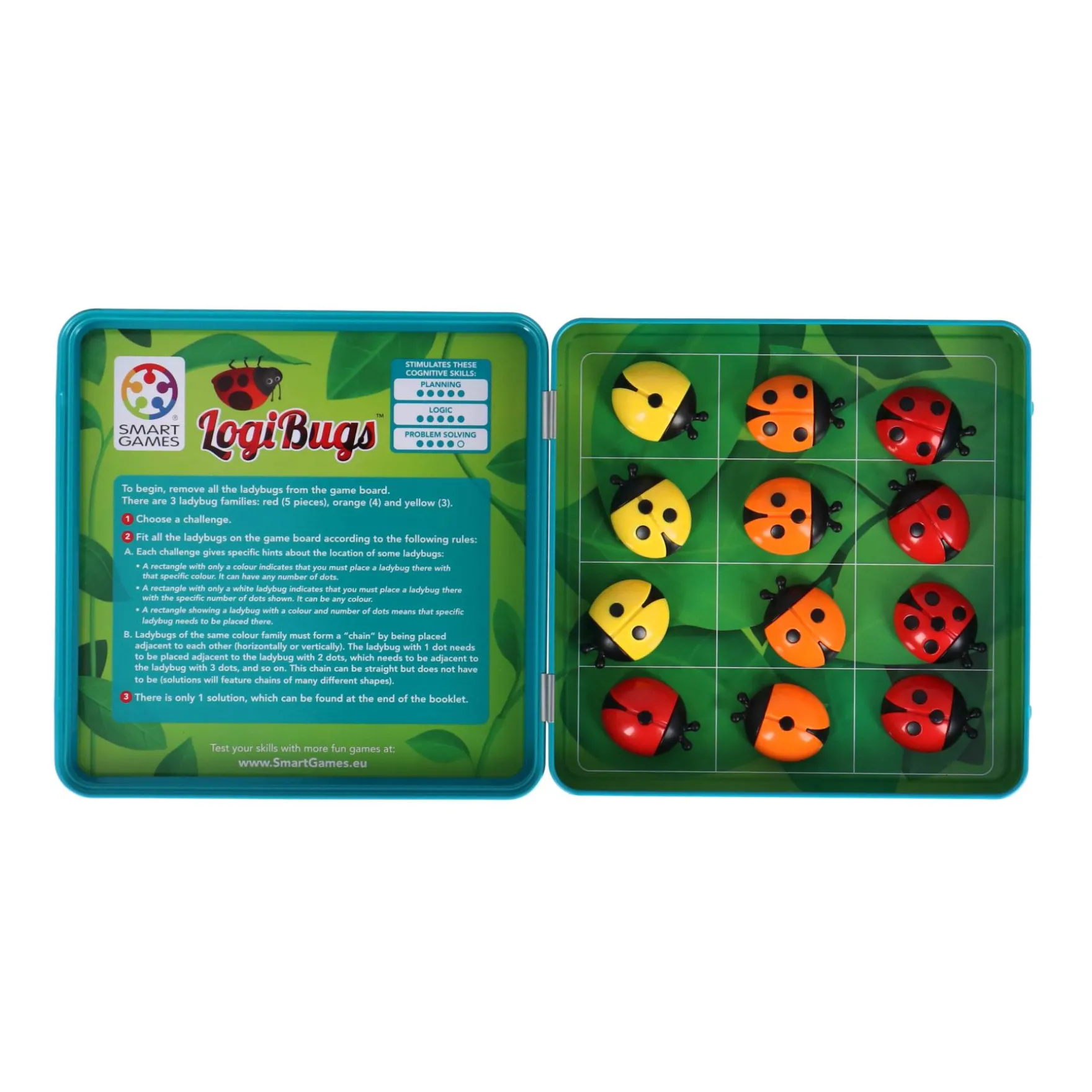 Dit denkspel is perfect voor solo-spelers en biedt een progressieve reeks uitdagingen, waardoor het geschikt is voor kinderen van verschillende leeftijden en niveaus. Logibugs combineert plezier en leren op een unieke manier, waardoor het een waardevolle aanvulling is op de spellencollectie van elk kind. Geef ze de kans om hun brein te laten kraken met Logibugs en laat de puzzelavonturen beginnen!