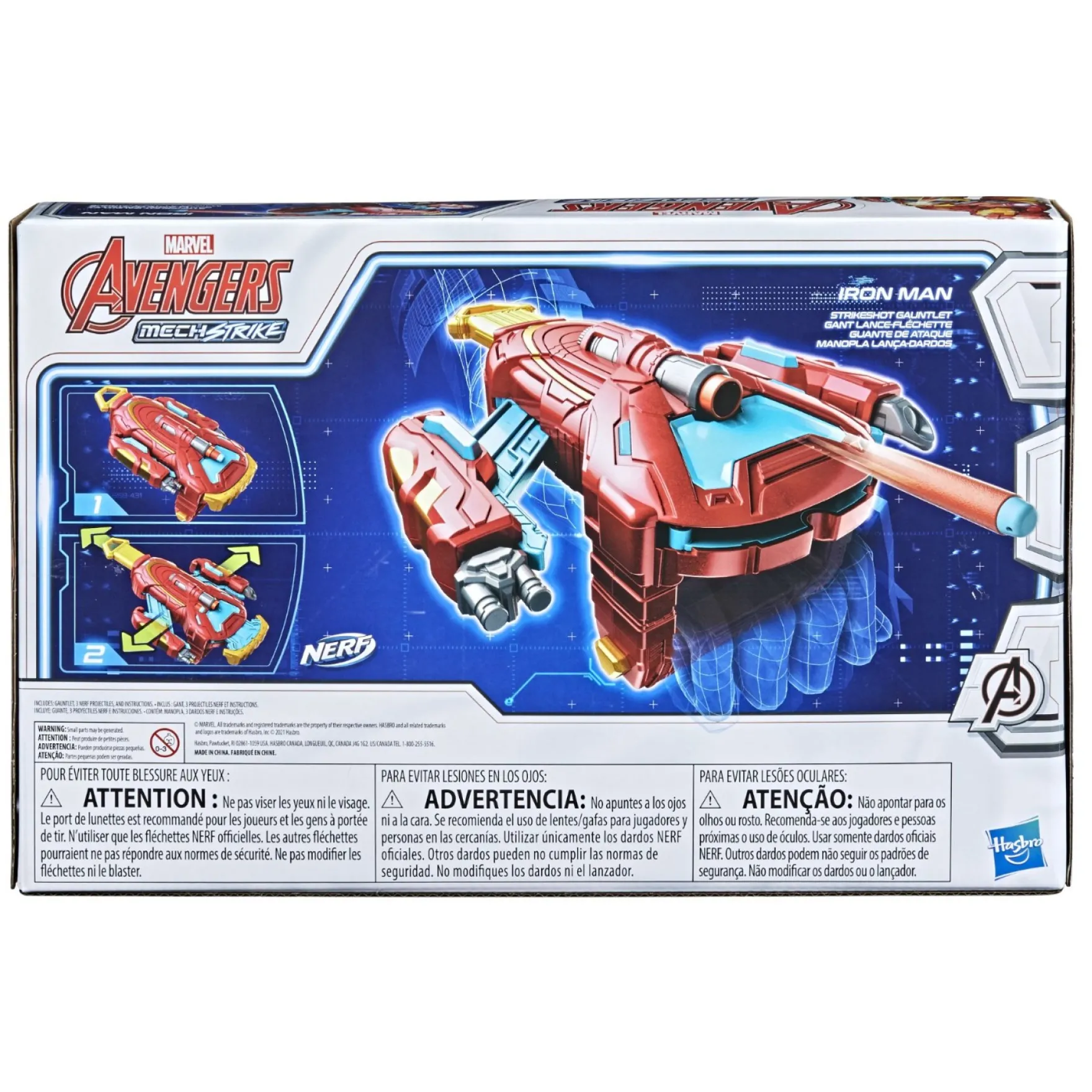 - DE STERKSTE MECHS VAN DE WERELD: de Iron Man Strikeshot-handschoen zet uit op je hand en vuurt NERF-projectielen af om de vijand te bestrijden. De activering van de wapenrusting is de laatste hoop van de planeet tegen de ogenschijnlijk onoverwinnelijke aanvallers