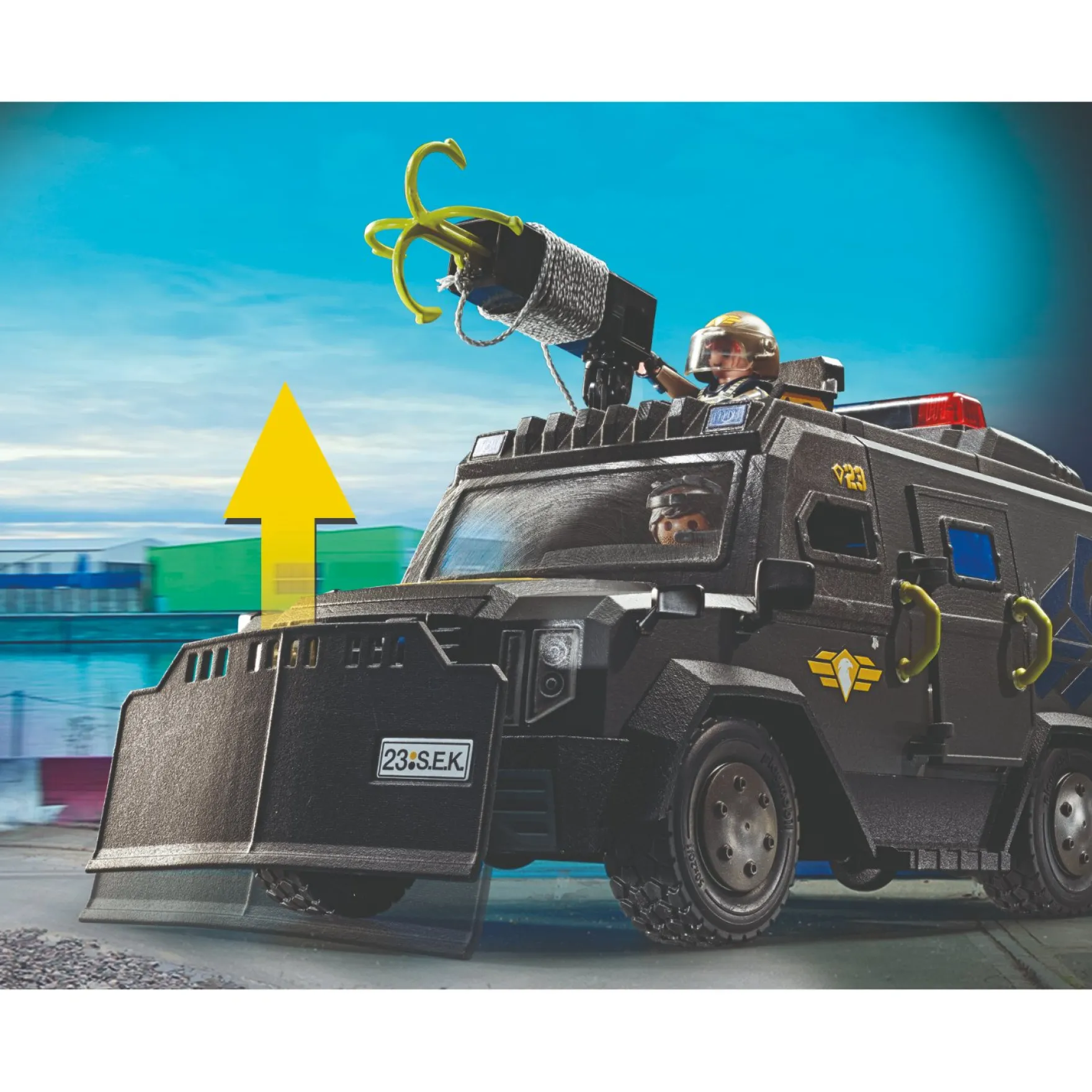 Op het dak staat een bemande toren van waaruit je een grijphaak of waterpijl kunt afvuren. Met licht- en geluidsmodule voor nog meer actie. De set wordt geleverd met twee dappere politieagenten en een overvloed aan spannende politieaccessoires.