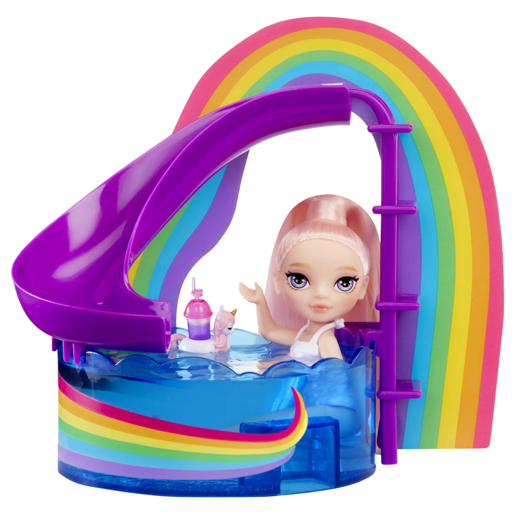 Beleef eindeloos speelplezier in stijl met deze tropische Rainbow High-set!