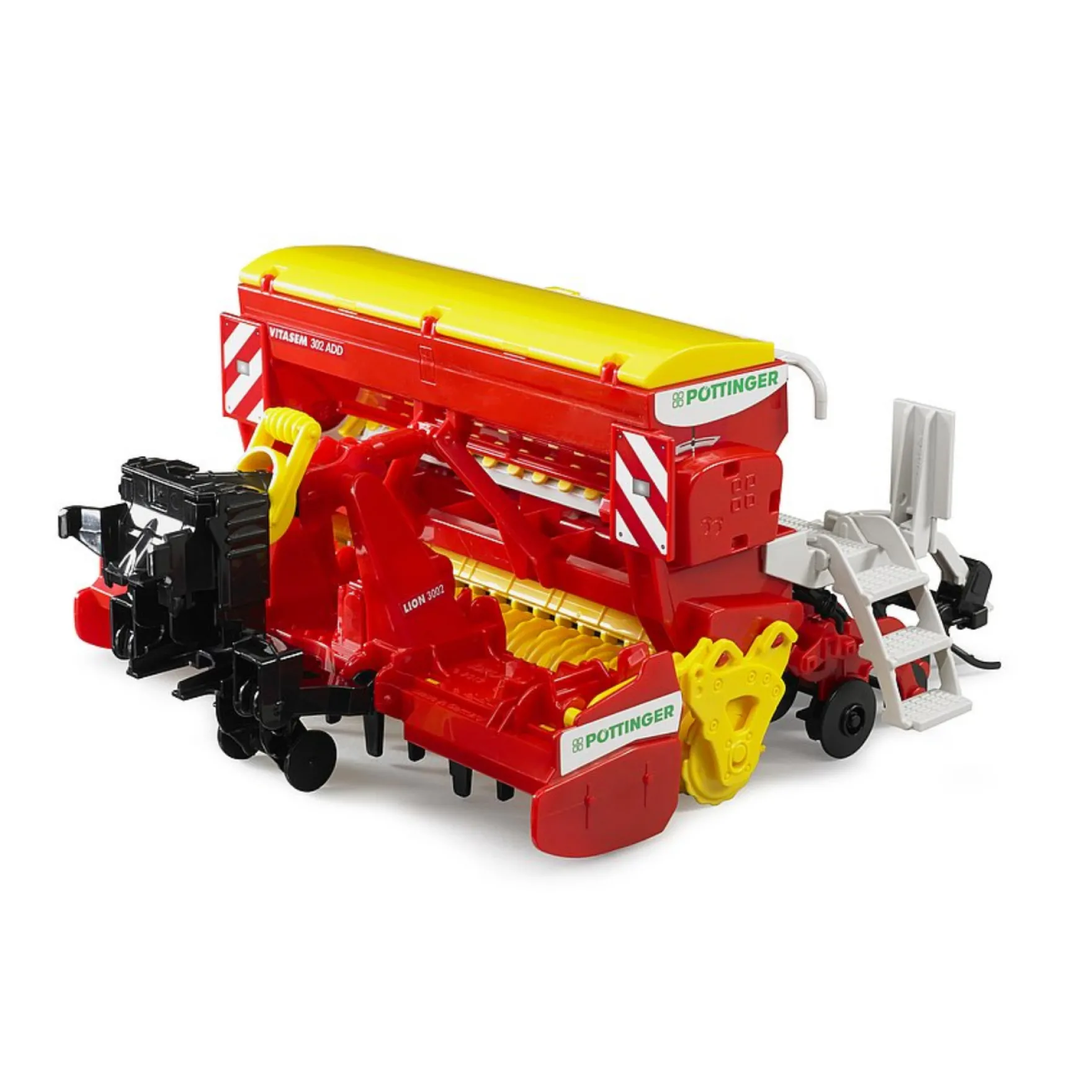 Met de Pöttinger Vitasem 302ADD zaaimachine van Bruder kun jij heel snel en netjes zaaien. Maak de zaaimachine vast achter je tractor (niet inbegrepen), vul de zaadtank, die je echt kunt openen, met zaadjes (niet inbegrepen) en rijd het land op. De zaaimachine zal eerst netjes de grond opzij duwen, om mooie voren te creëren om de zaadjes in te leggen. Daarna legt hij de zaadjes in die voren. Tot slot bedekt de zaaimachine de voren weer met grond, zodat de zaadjes netjes bedekt worden. En dat allemaal met één machine die meerdere rijen tegelijk doet!
