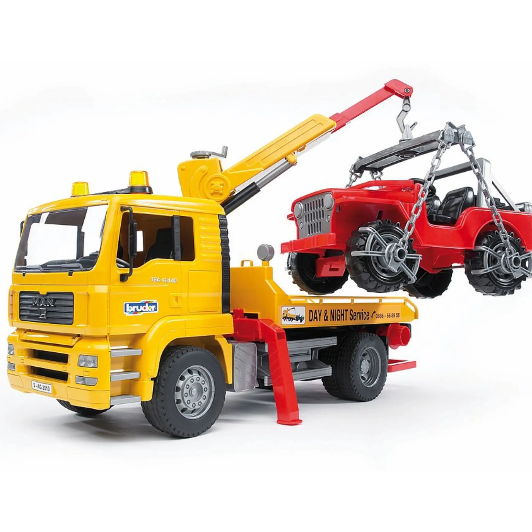 Iedereen heeft deze truck wel eens in actie gezien toen hij een voertuig dat betrokken was bij een ongeluk meenam om te repareren. Om voertuigen te bergen kan het laadplatform gedemonteerd worden en de kraan kan verlengd worden en kan draaien. De trekhaak is uitschuifbaar en het mechanisme voor het laden bestaat uit kettingen. Wielklampen zorgen ervoor dat het voertuig veilig en snel versleept kan worden. Wielblokken en uitschuifbare steunpoten zorgen voor stabiliteit en de banden met profiel maken het plaatje compleet. De kantelbare bestuurderscabine van de MAN zorgt dat je een blik op de motor kan werpen en de spiegels aan de cabine kunnen dichtgeklapt worden.