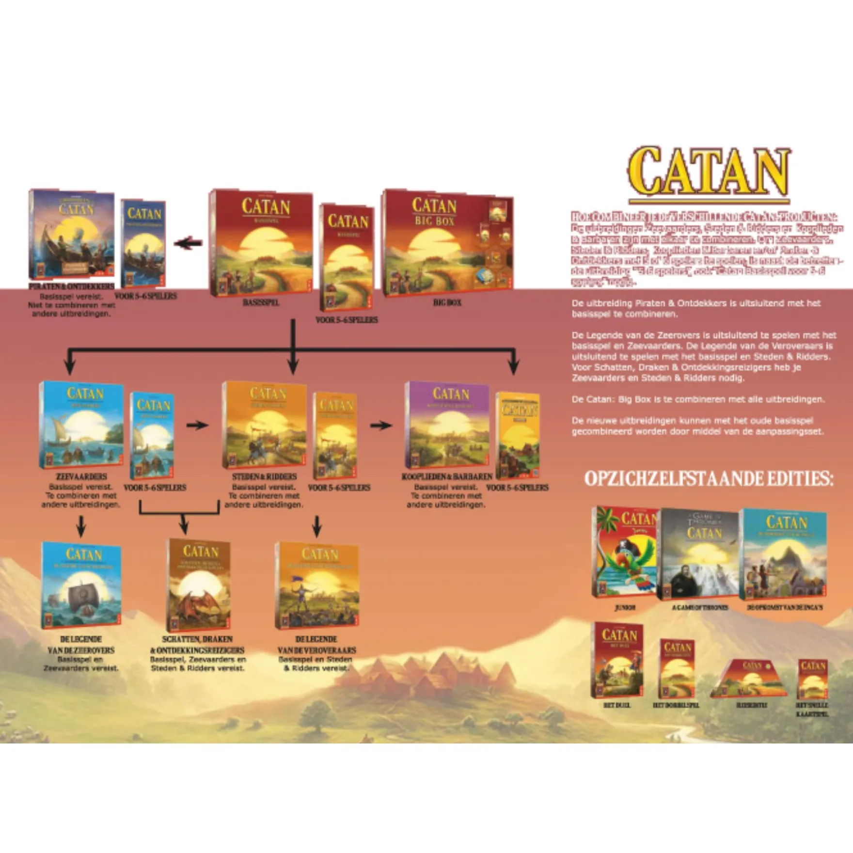 Je begint je avontuur met het plaatsen van 2 dorpen op een dynamisch speelbord, omringd door akkers, weiden, heuvels, bergen en bossen. Bij elke beurt werp je 2 dobbelstenen om te bepalen welke grondstoffen jouw dorpen opleveren, afhankelijk van hun strategische positie. Daarna is het tijd om te handelen, zowel met de bank als met je medespelers, want je zult niet alle benodigde grondstoffen ontvangen. En die zijn essentieel voor de bouw van nieuwe dorpen, wegen en steden. Vergeet ook niet om ontwikkelingskaarten te bemachtigen voor speciale acties. Maar wees op je hoede, want er zwerft een struikrover rond die bepaalde gebieden leeg rooft.