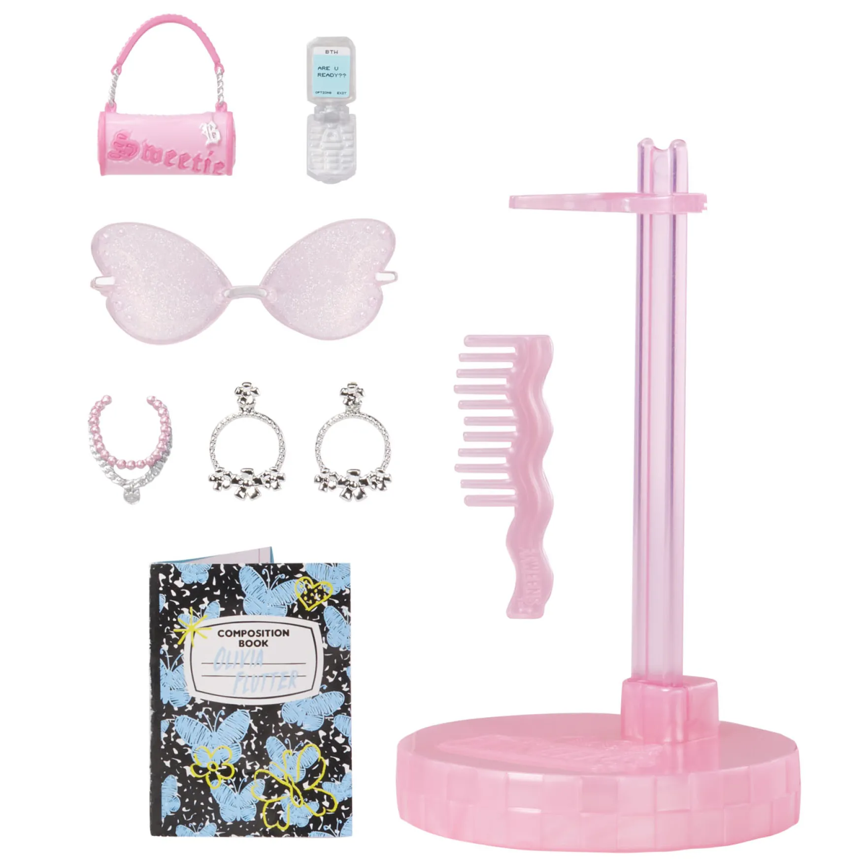 - PAK 15 VERRASSINGEN UIT waaronder een Tweens-modepop, coole mode, schoenen, accessoires, zonnebril, oorbellen, een ketting, tasje met vlinderbedeltje, kettingriem, tasje, openklapbare telefoon, haarborstel en poppenstandaard