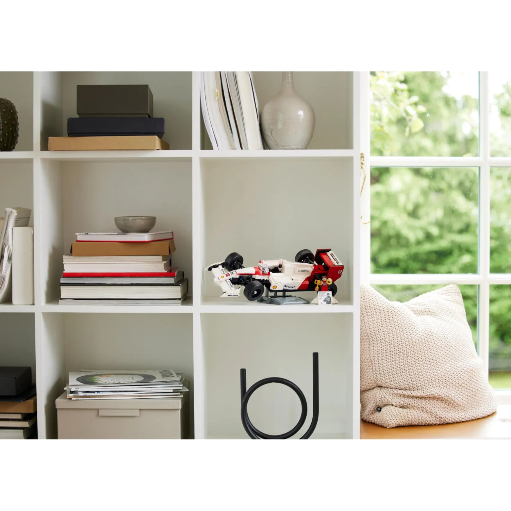 - Bureaudecoratie voor thuis of op kantoor – inclusief een McLaren MP4/4 displaystandaard met gedrukte voertuigstatistieken en een displaystandaard voor de Ayrton Senna minifiguur met een foto en een bekend citaat van Senna