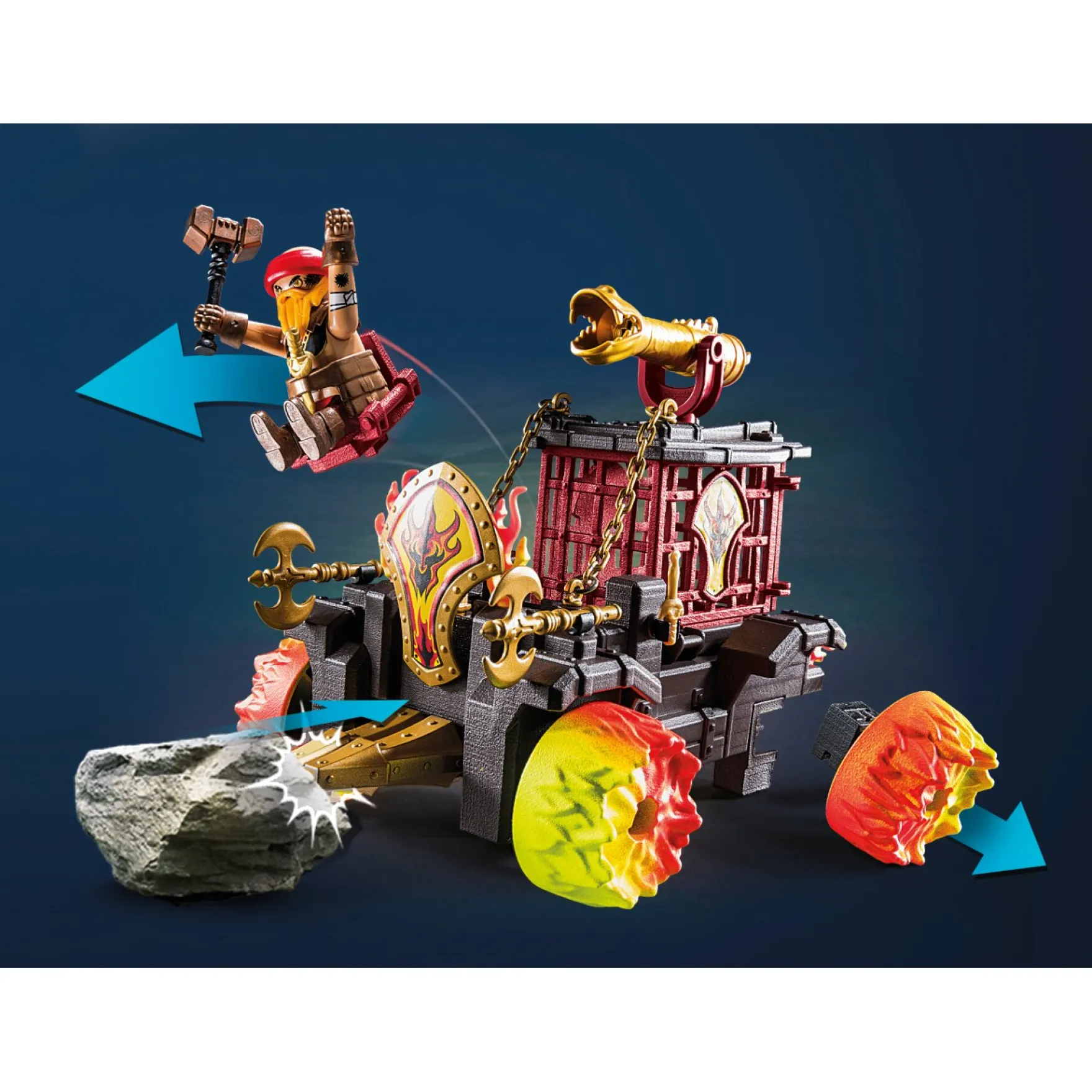 • Een meeslepende ridder speelset bestaande uit 46 onderdelen, met een opvallend PLAYMOBIL-figuur, een brandbestrijdingskar voorzien van een stoere stormram, vurige vlamwielen, een kooi, vlamprojectielen, wapens en tal van andere extra’s om avontuurlijke rollenspellen tot leven te brengen.