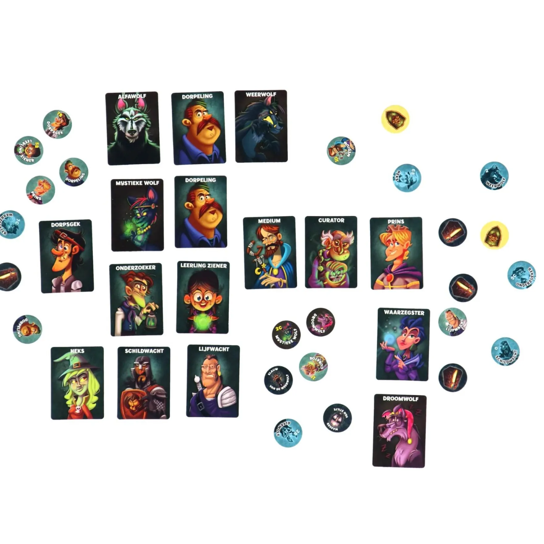 Met de 16 rollenkaarten, 16 rollenfiches, 2 schilden en 6 artefacten heb je alles wat je nodig hebt om het spel te spelen. De spelregels zijn eenvoudig te begrijpen, maar het spel zelf zit vol met spanning en verrassingen.
