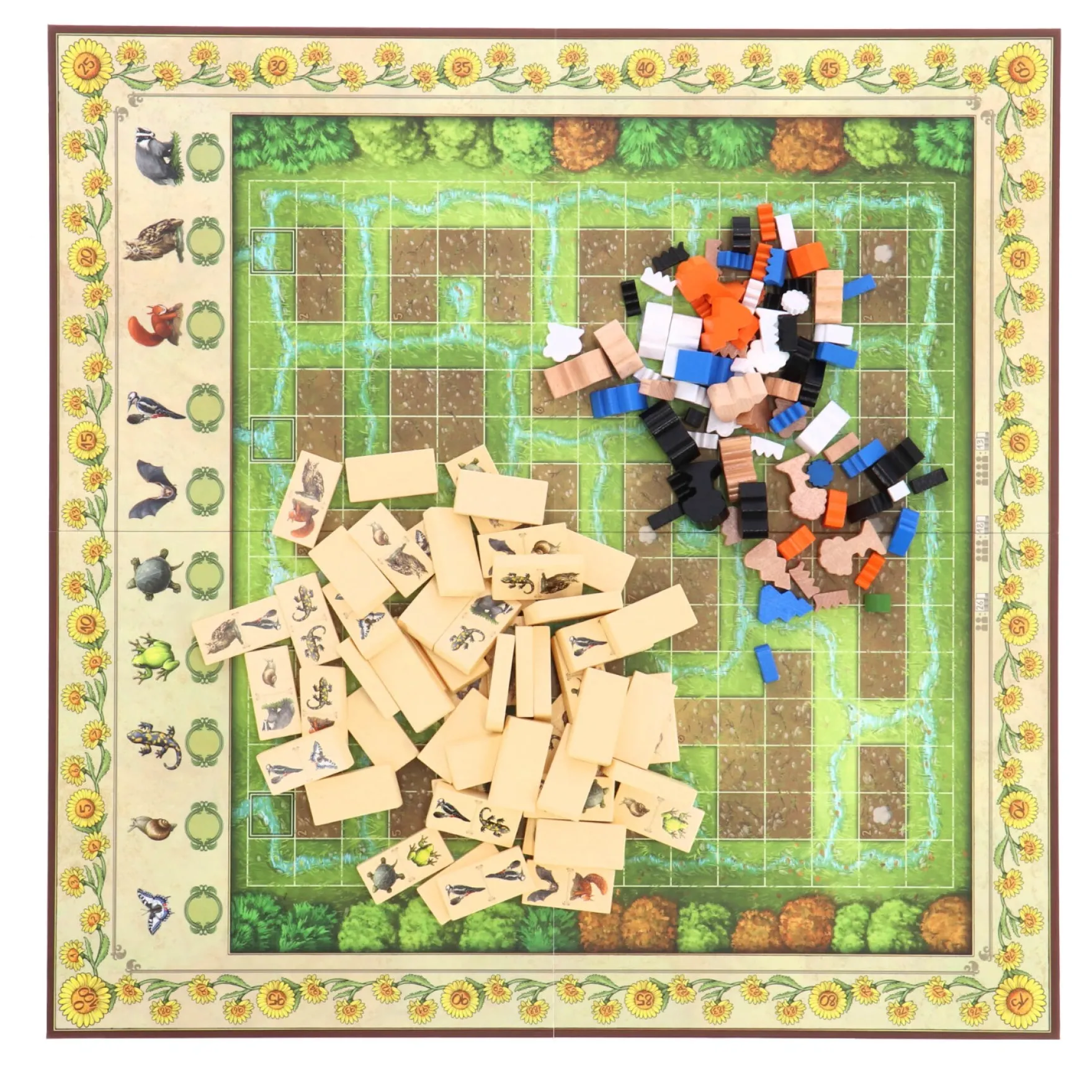 In “Renature” krijgt elke speler een bord vol met houten stukken die prachtige natuurlijke elementen voorstellen: graszoden, struiken, dennen en eiken. Gebruik deze stukken om de overhand te krijgen in diverse tuinen en claim gebieden. De dominostenen, elk versierd met twee van de tien dierenmotieven, vormen de kern van het spel. Plaats een dominosteen naast een andere met hetzelfde dier en breng daarmee jouw natuurlijke pracht tot leven in de bruine velden van het speelbord.