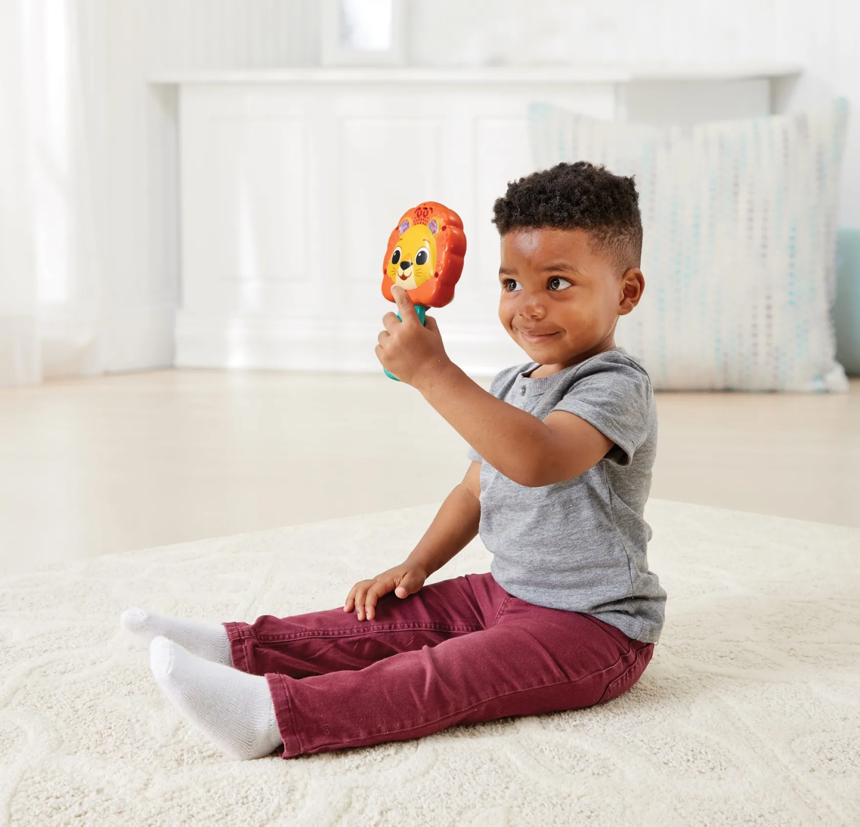 - Speel een kiekeboe-spelletje met Brullie en zie hoe hij telkens weer verschijnt en verdwijnt